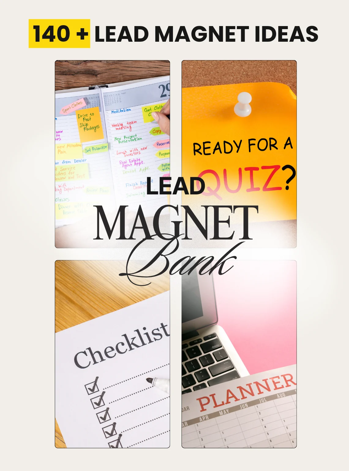 Never run out of Leads magnet ideas again -This 140+ idea proven bank helps you attract the right leads, build Your list Faster, and grow without the guesswork.