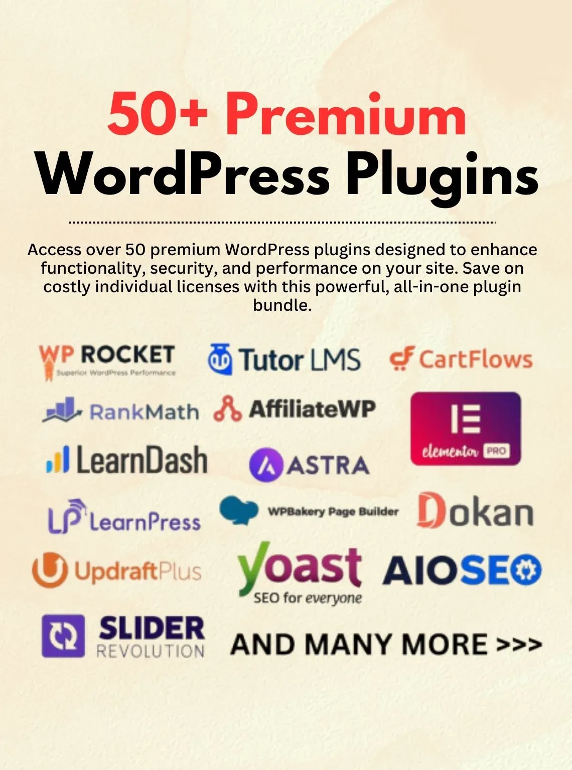 50+ Paid WordPress Plugins (Elementor Pro, Pixel Your Site Pro, Cart Flow Pro, ect. ).